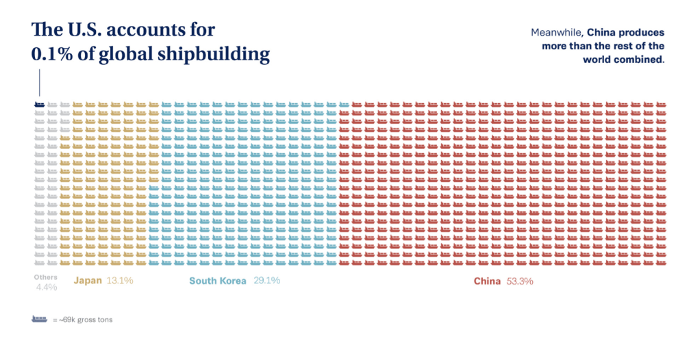 Por otro lado, y en lo que hace a capacidades de construcción naval civil, la situación es incluso peor. Un estudio del Center for Strategic and International Studies, publicado en 2024, da cuenta de lo anterior: los astilleros americanos representan el 0.1% de la capacidad global, mientras que China posee el 53.3%.